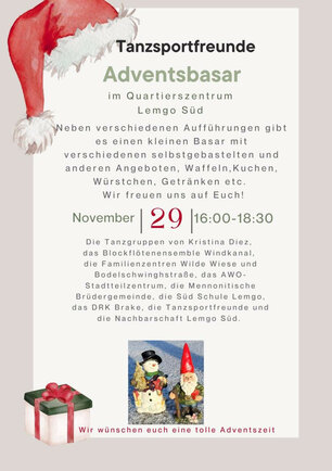 Am Samstag, 29. November ist es ab 16.00 Uhr wieder soweit, beim diesjährigen Adventsbasar präsentierten sich verschiedene Gruppen, Einrichtungen und Vereine aus dem Lemgoer Süden im Quartierszentrum Lemgo Süd am Kleinen Schratweg 50, Lemgo. Neben verschiedenen Vorführungen in einem abwechslungsreichen Programm, gibt es Mitmach- und Informationsstände und auch für das leibliche Wohl stehen Angebote bereit. Die Federführung der rund 2½-stündigen Veranstaltung liegt in diesem Jahr erstmals bei den Tanzsportfreunden Lemgo e.V. unter Leitung von Günther Neitzel.